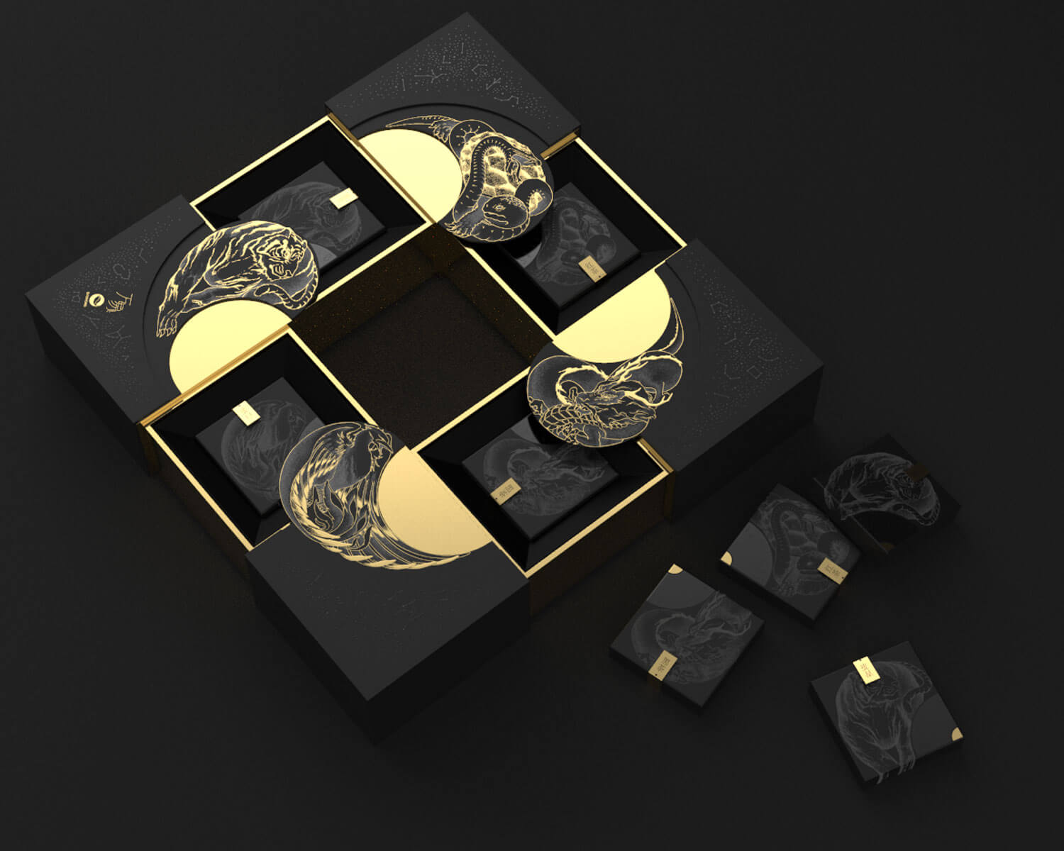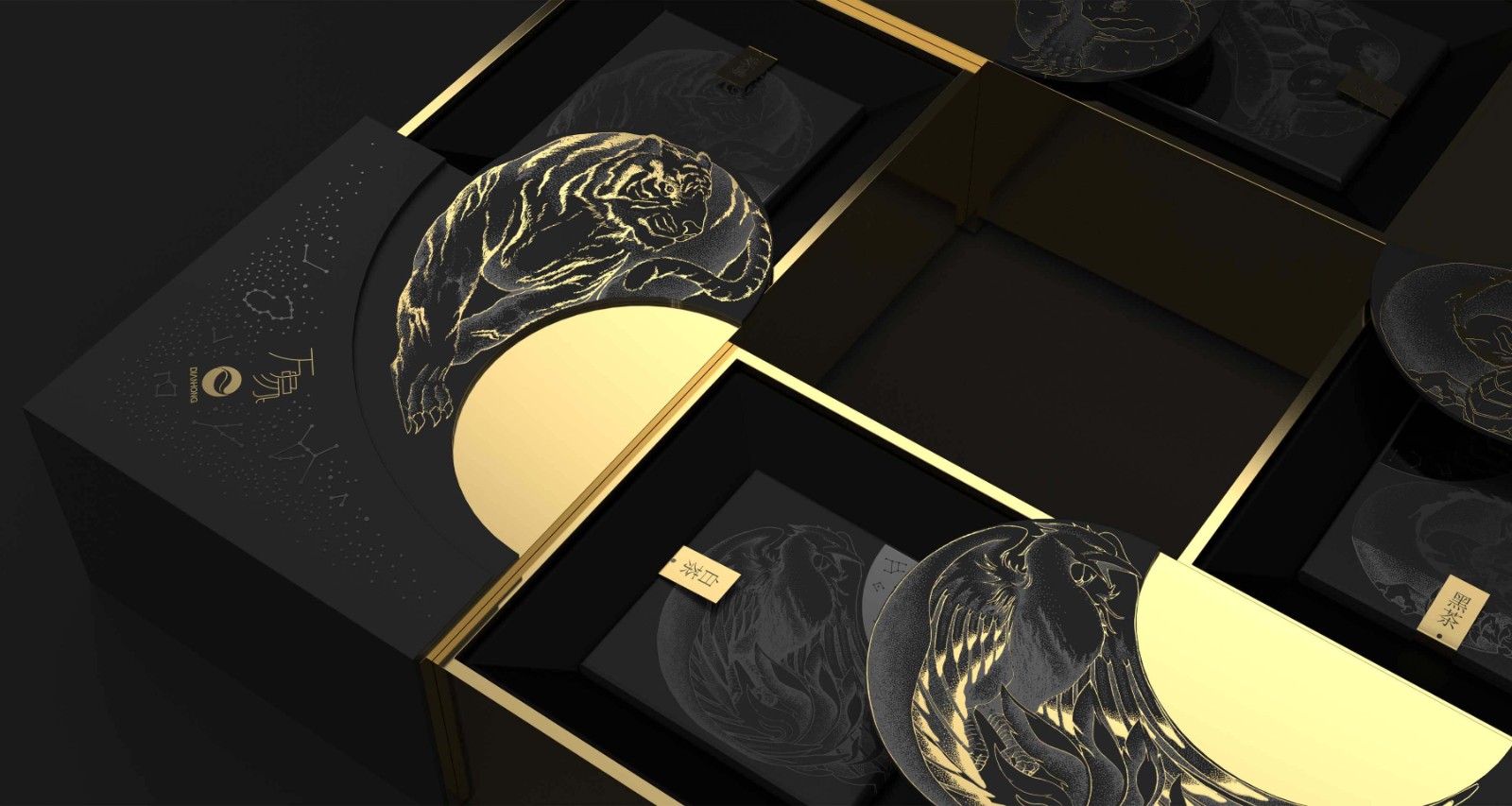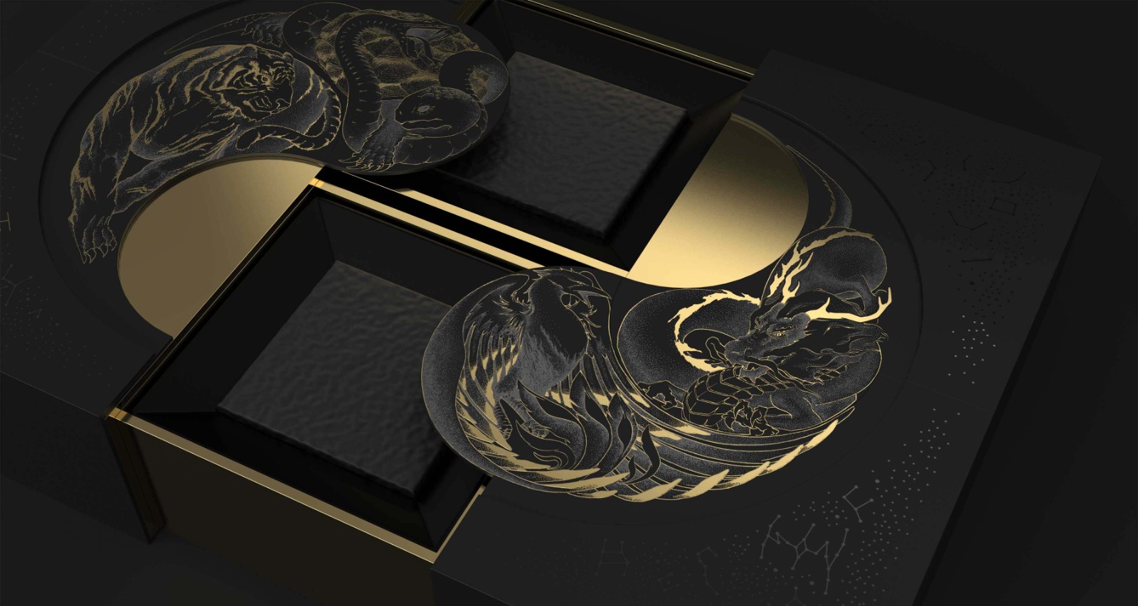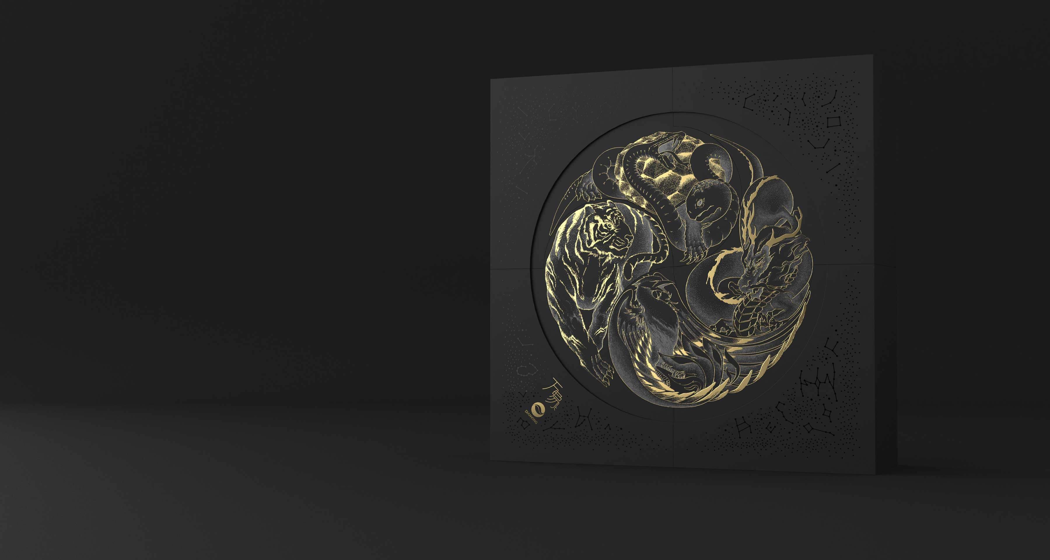 在中國傳統(tǒng)文化中,古人懷著對星空的敬畏及信仰,將天空分成東、西、南、北,用青龍、白虎、朱雀、玄武作為其守護(hù)神獸,此為“四象”。因此,在此款產(chǎn)品的創(chuàng)作過程中,