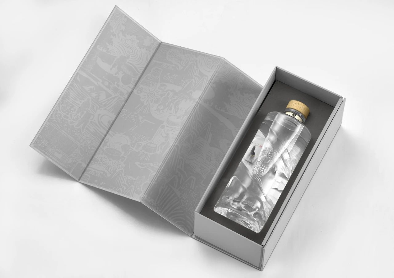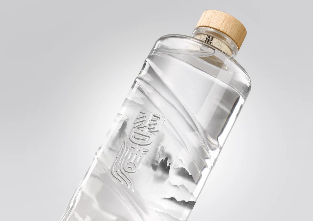 大自然是最好的設(shè)計(jì)師,這款酒瓶設(shè)計(jì)運(yùn)用仿生手法來(lái)表現(xiàn)。通過(guò)石頭機(jī)理材質(zhì)來(lái)代表土地,透明蜿蜒曲折玻璃來(lái)代表流水。既突出產(chǎn)品生態(tài)純粹,也能契合“曲水流觴”典故。