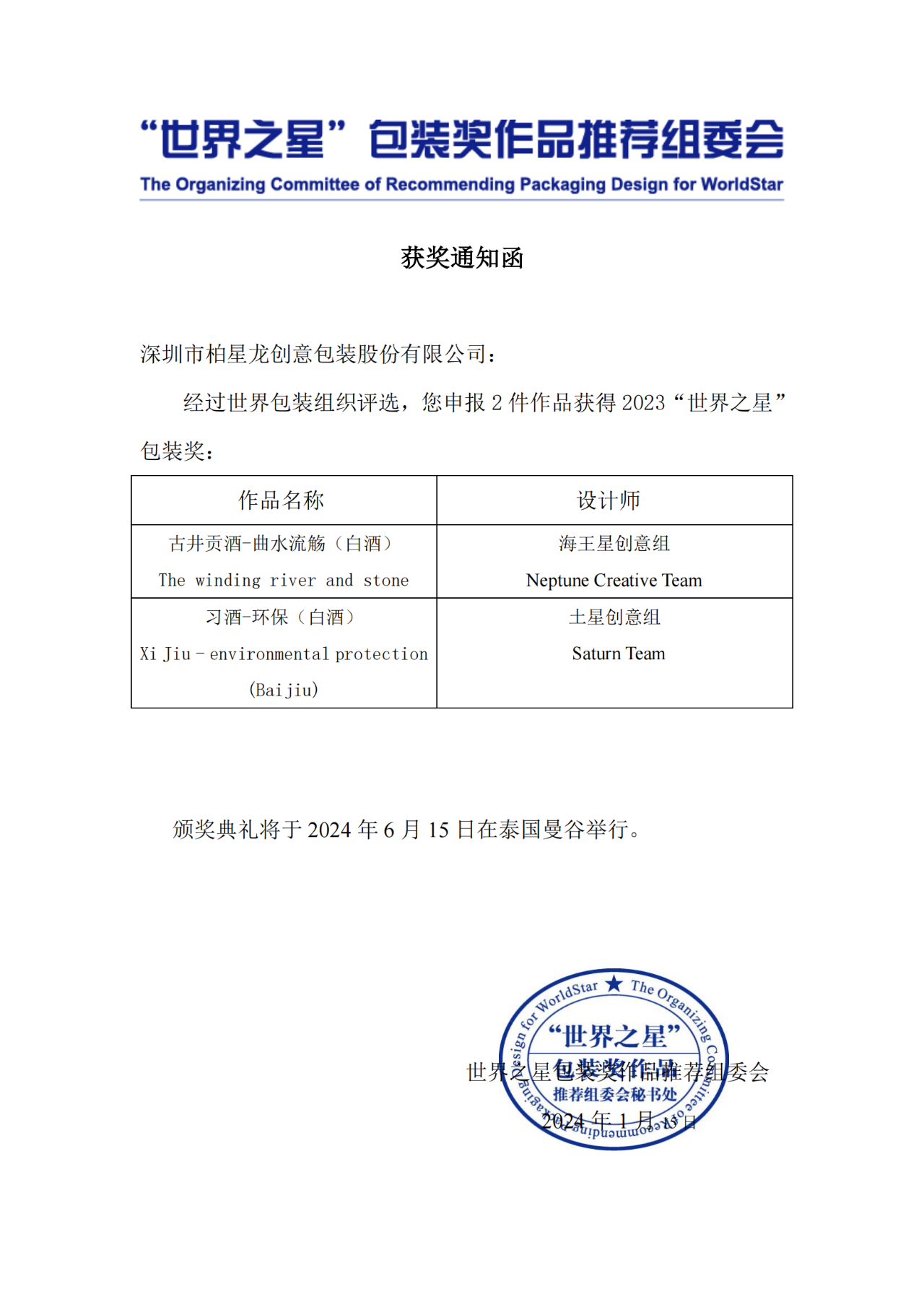2024年,柏星龍?jiān)俅问盏胶M庀灿?/span>柏星龍團(tuán)隊(duì)2件創(chuàng)意包裝設(shè)計(jì)作品榮獲“世界之星”設(shè)計(jì)獎(jiǎng)
