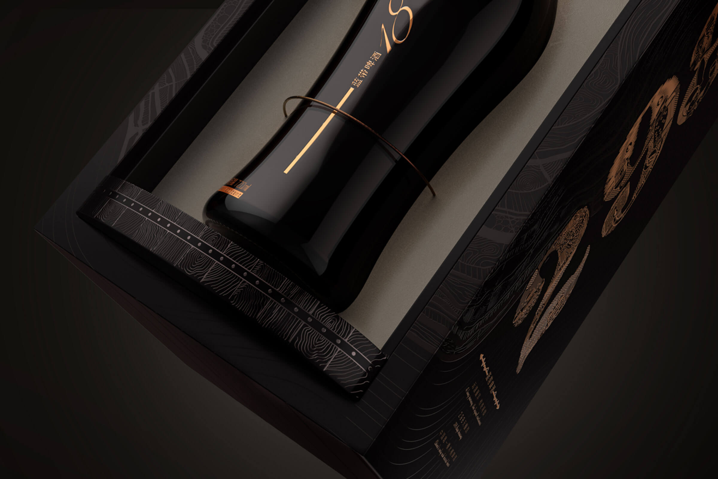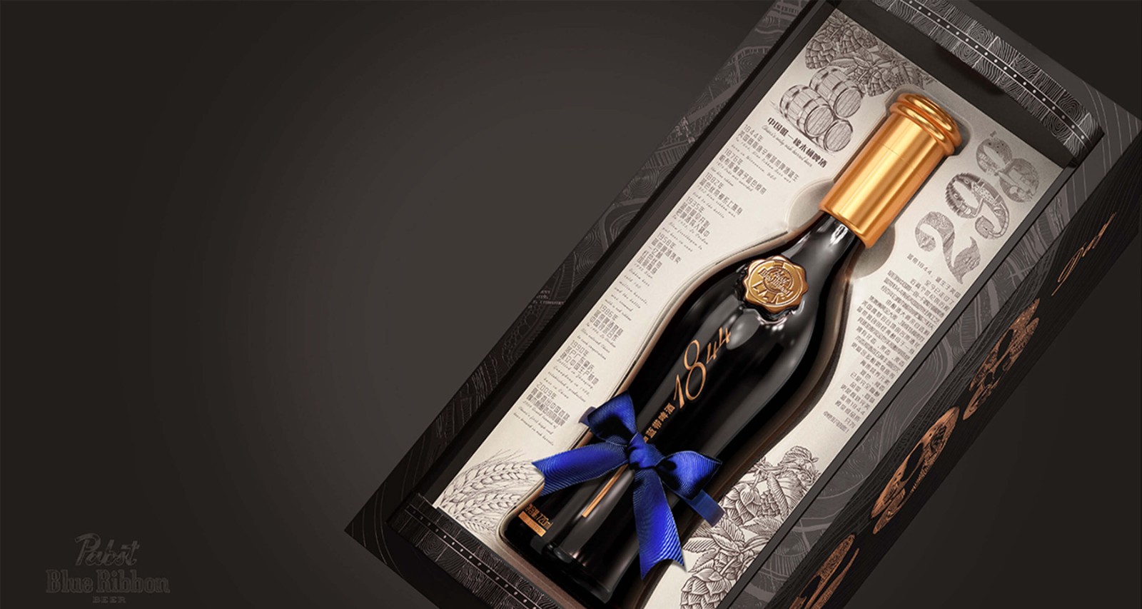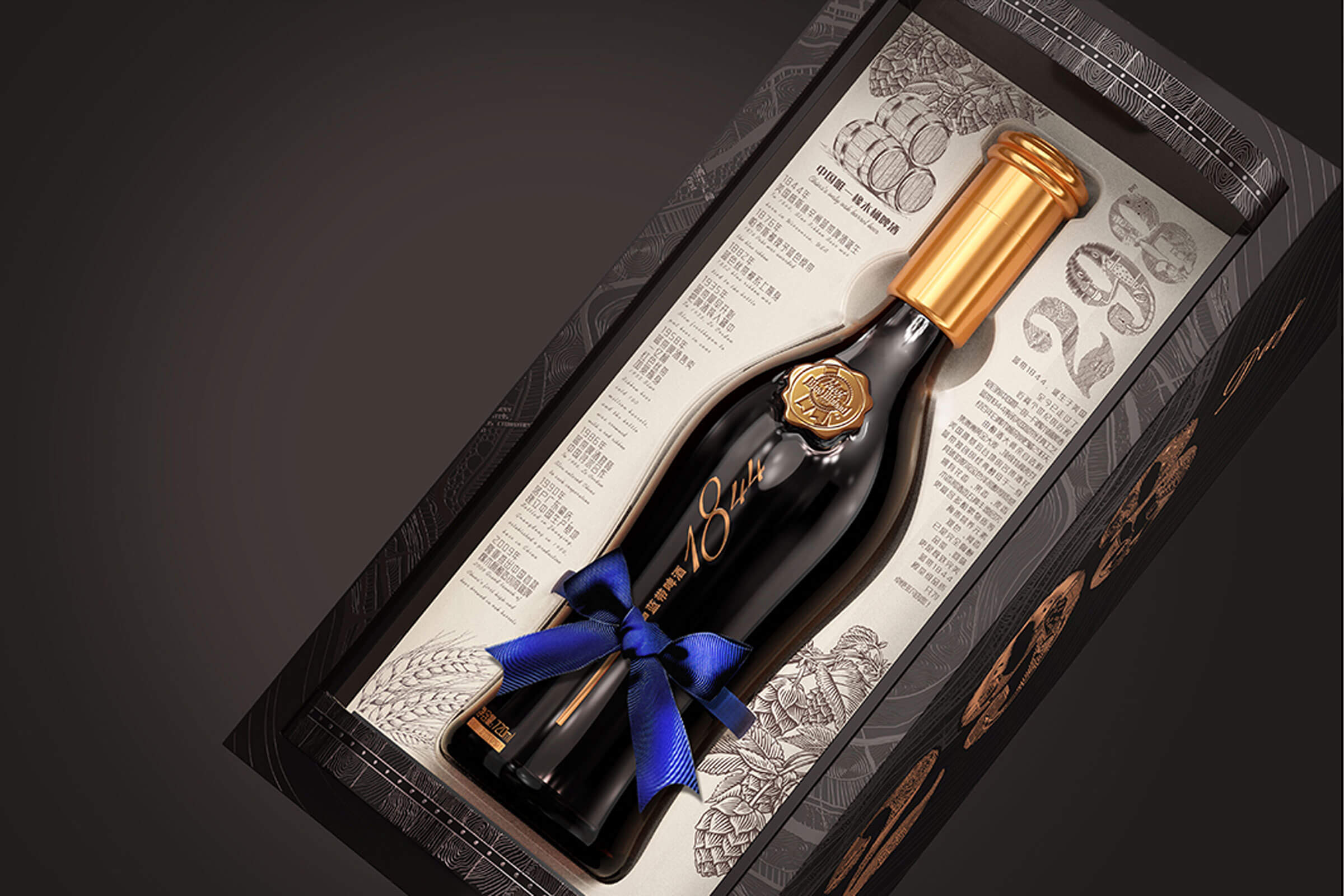 基于藍帶啤酒的品牌理念及核心價值,整個禮盒仿照了橡木桶釀造的感覺,采用了旋轉開啟的盒型,內盒上下底座的木紋和柳釘燙金工藝的高級感,隨著旋轉禮盒而呈現(xiàn)藍帶1844啤酒緩緩轉身,如同走過百年歷史面向今天的消費者。