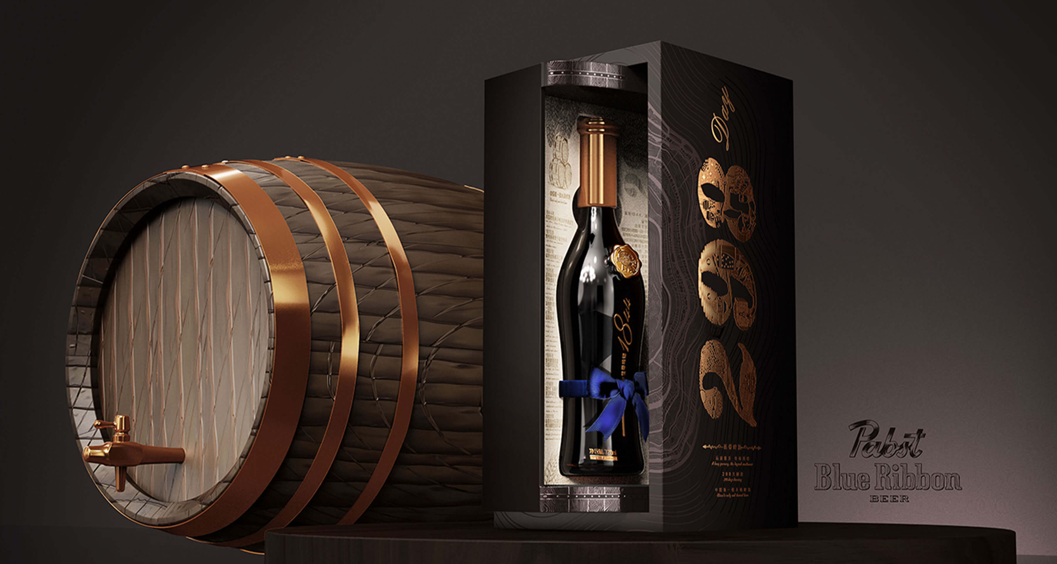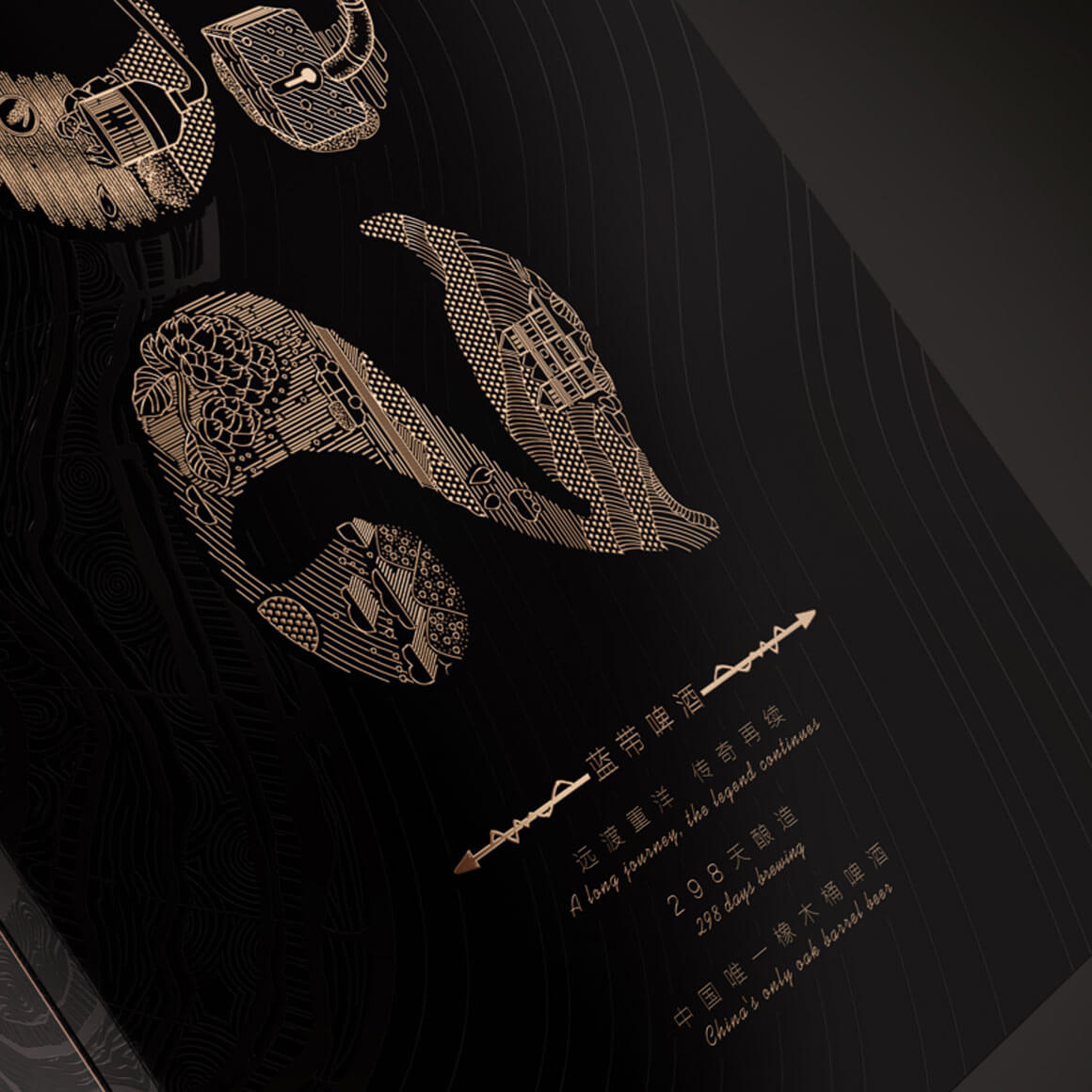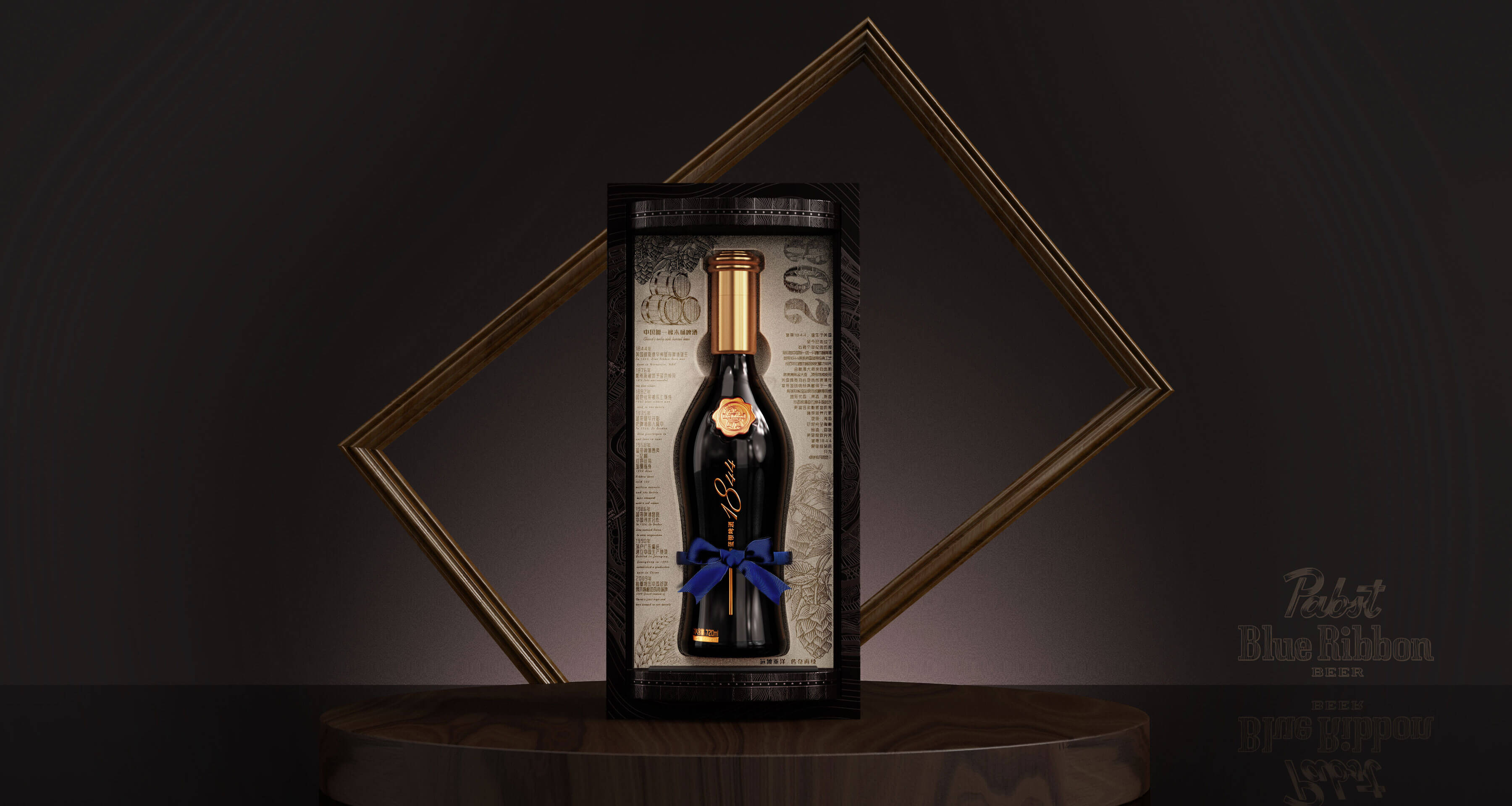 基于藍帶啤酒的品牌理念及核心價值,整個禮盒仿照了橡木桶釀造的感覺,采用了旋轉開啟的盒型,內盒上下底座的木紋和柳釘燙金工藝的高級感,隨著旋轉禮盒而呈現(xiàn)藍帶1844啤酒緩緩轉身,如同走過百年歷史面向今天的消費者。