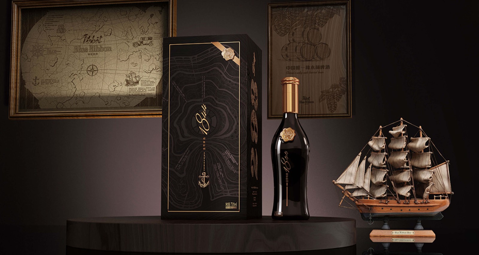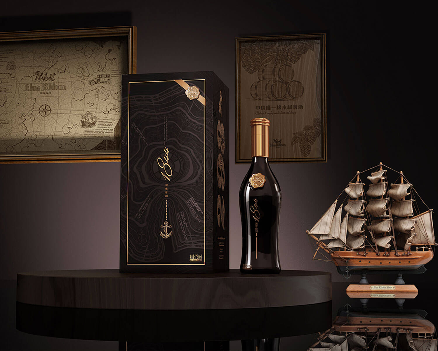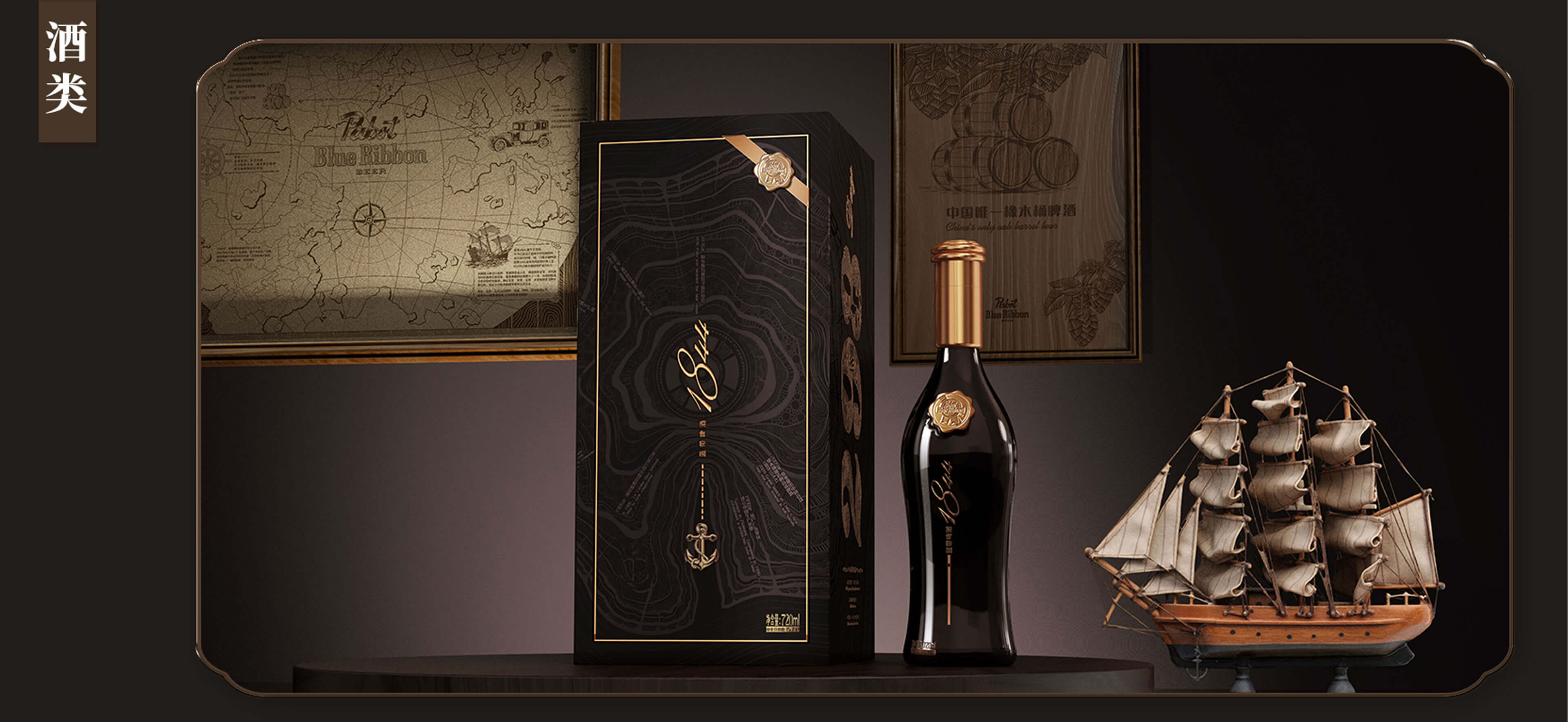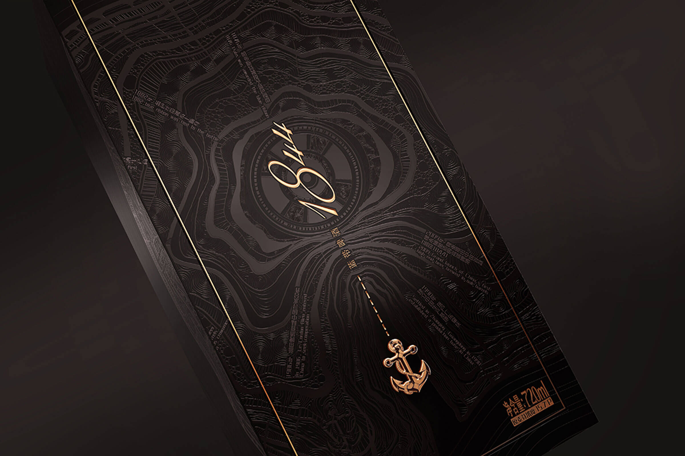 柏星龍設計師巧妙地將產品禮盒紋飾與火漆logo融為一體,禮盒上的船錨沿虛線向下,伴隨底紋年輪向外延伸,寓意藍帶品牌歷經時光洗禮愈發(fā)輝煌。更將這份品質與榮譽賦予瓶身,藍絲帶在素雅禮盒上煥發(fā)獨特亮色,猶如瓶身的紳士領結,盡顯品牌高端品質的藝術魅力。