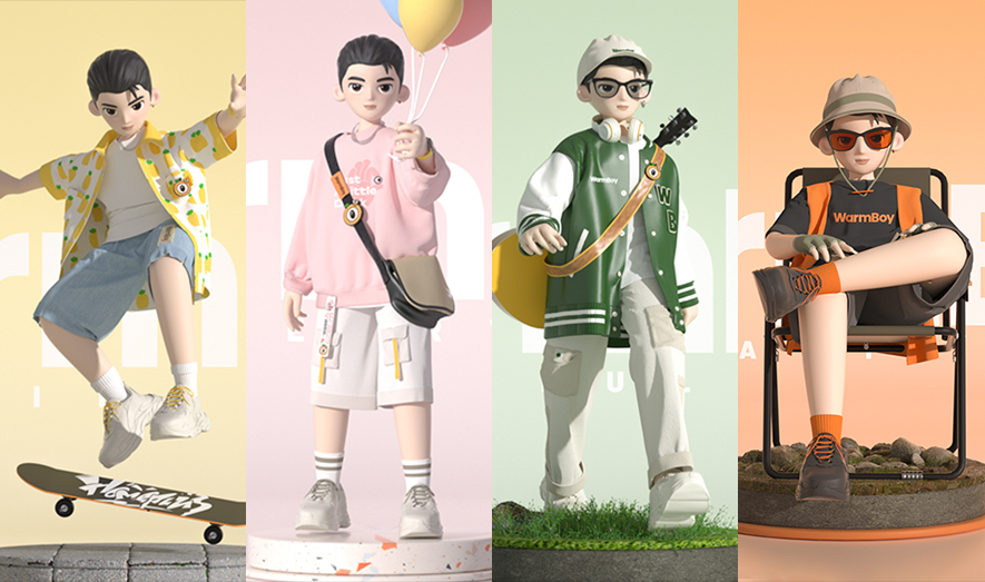 「小暖男」桂圓果酒主張四季皆可飲用,冬天暖著喝,夏天冰著喝,春秋也能喝,因此在IP人物服飾的設(shè)定上既有春裝夏裝,也包括了秋裝跟冬裝,每套服飾根據(jù)不同口味不同性格的人物特色,均有自己的主色調(diào)。