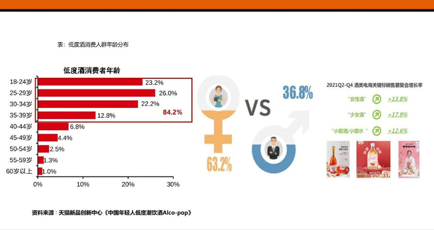 經(jīng)過線上市場(chǎng)了解,數(shù)據(jù)顯示,低度酒消費(fèi)者年齡分布在18-40歲,占據(jù)超80%的消費(fèi)人群,其中超半數(shù)為女性消費(fèi)者;隨著“她經(jīng)濟(jì)”飛速增長(zhǎng)中,女性群體也成為酒類消費(fèi)群體的重要力量。