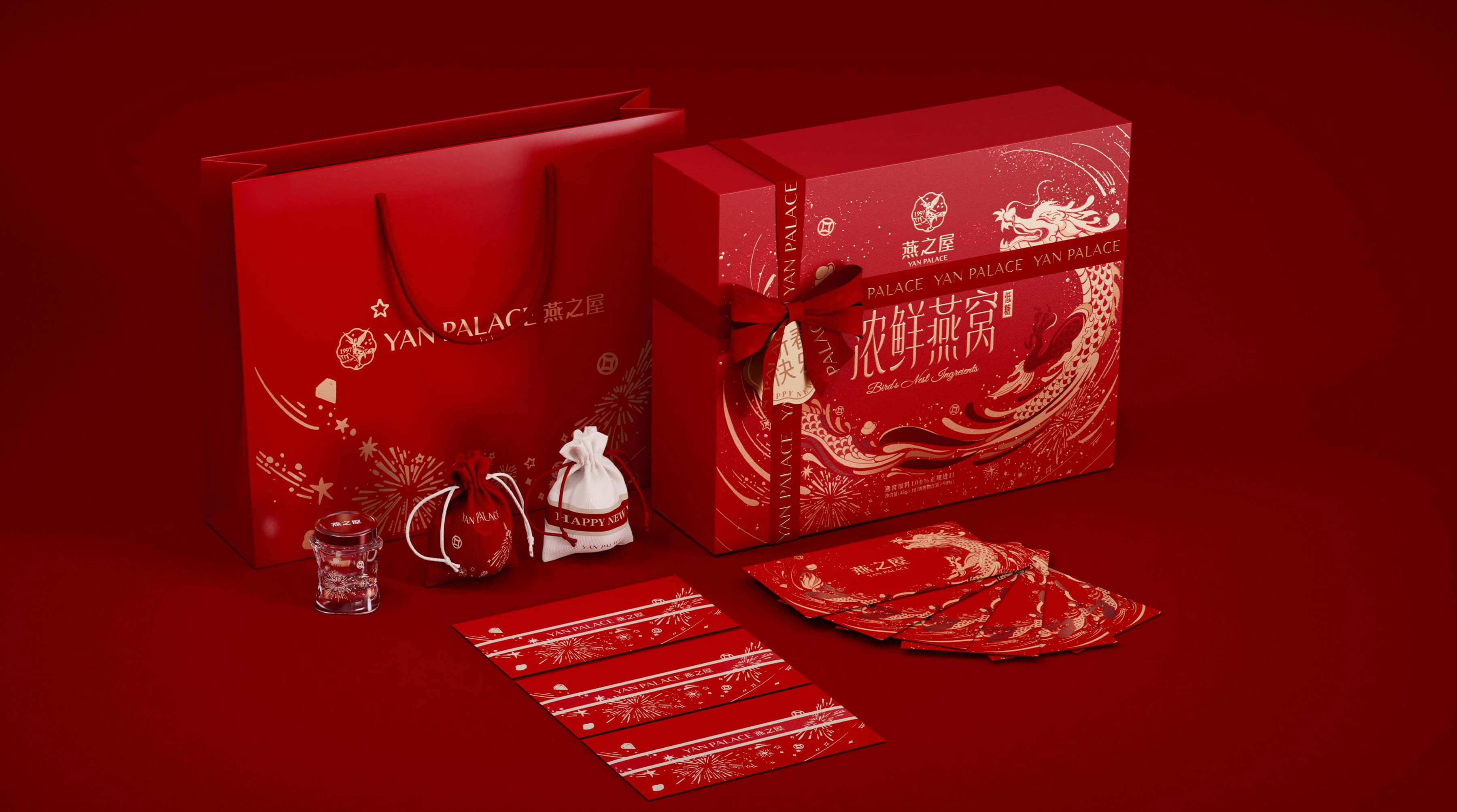 龍的形象采用手繪插畫(huà)形式表現(xiàn),結(jié)合新年的熱鬧元素,構(gòu)成一幅喜氣洋洋的場(chǎng)景,中間圍繞著品牌,寓意將福氣與祥瑞送予燕之屋,同時(shí)將這一份東方的鮮禮--濃鮮燕窩代表的情意濃濃傳遞給尊貴的客戶(hù)。
