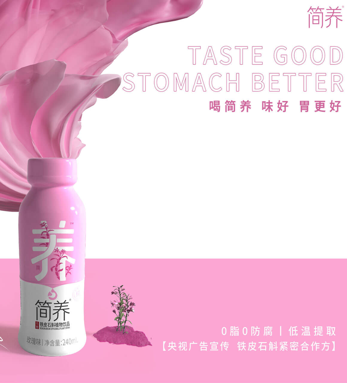 在產(chǎn)品設(shè)計(jì)構(gòu)思上我們以畫(huà)面中心為分割線,一口“簡(jiǎn)養(yǎng)”飲品持續(xù)養(yǎng)護(hù)你的“胃”,飲品也在分割處剛好滴落下來(lái),有一種溢出來(lái)的視覺(jué)感受。